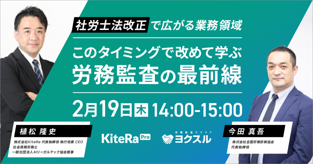 本セミナーでは、KiteRaとヨクスルがタッグを組み、社労士法改正を踏まえた労務監査の最新動向から、実務で押さえるべきポイント、今後の展望までをわかりやすく解説します。業界内外 の注目が集まる今だからこそ知っておきたい、労務監査の実情をお届けします。